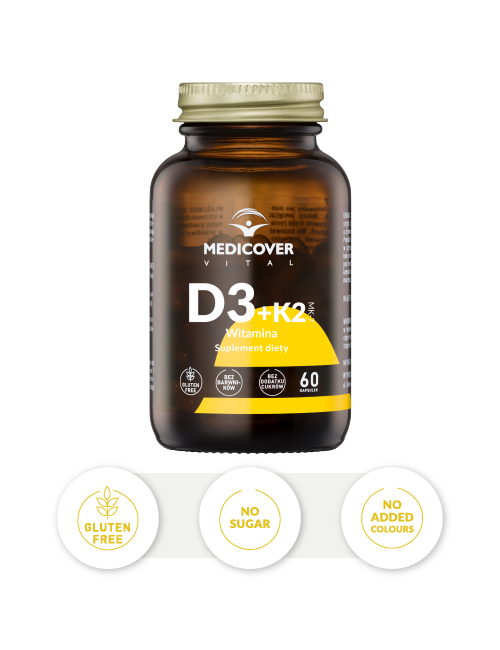 1 capsule of the Medicover Vital supplement contains 50 µg of vitamin D3 (1000% NRV) and 50 µg of vitamin K2 (67%)